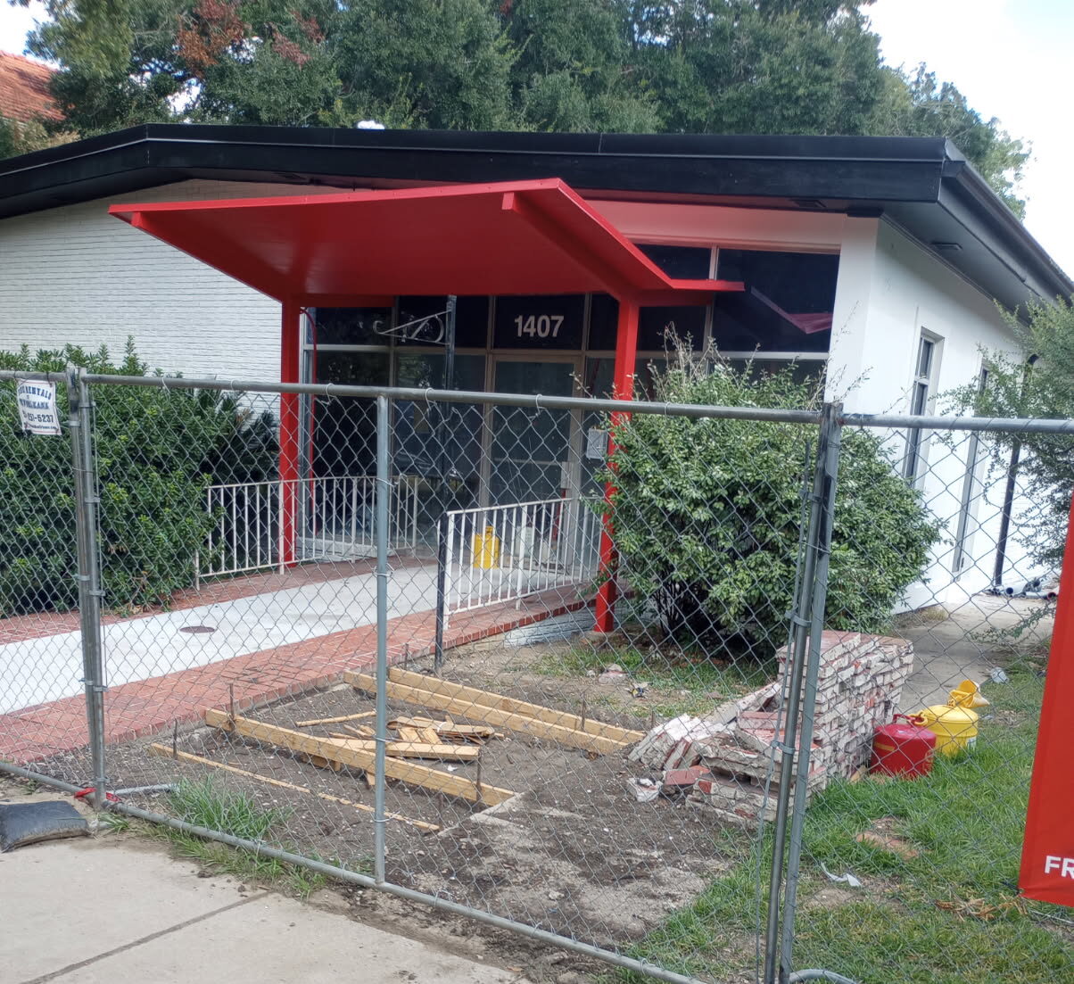 The awning at the front of 1407 S. Carrollton was painted bright red yesterday, 9/8/25.